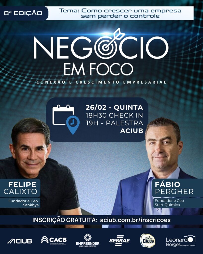 A programação contará com a participação de Felipe Calixto, fundador e CEO da Sankhya, e do ex-presidente da Aciub, Fábio Pergher, fundador e CEO da Start Química, dois empresários reconhecidos nacionalmente por suas trajetórias de crescimento sustentável e gestão estratégica. Durante o encontro, os convidados irão compartilhar experiências práticas, desafios enfrentados ao longo da jornada empresarial e estratégias para escalar negócios mantendo eficiência, governança e competitividade.
