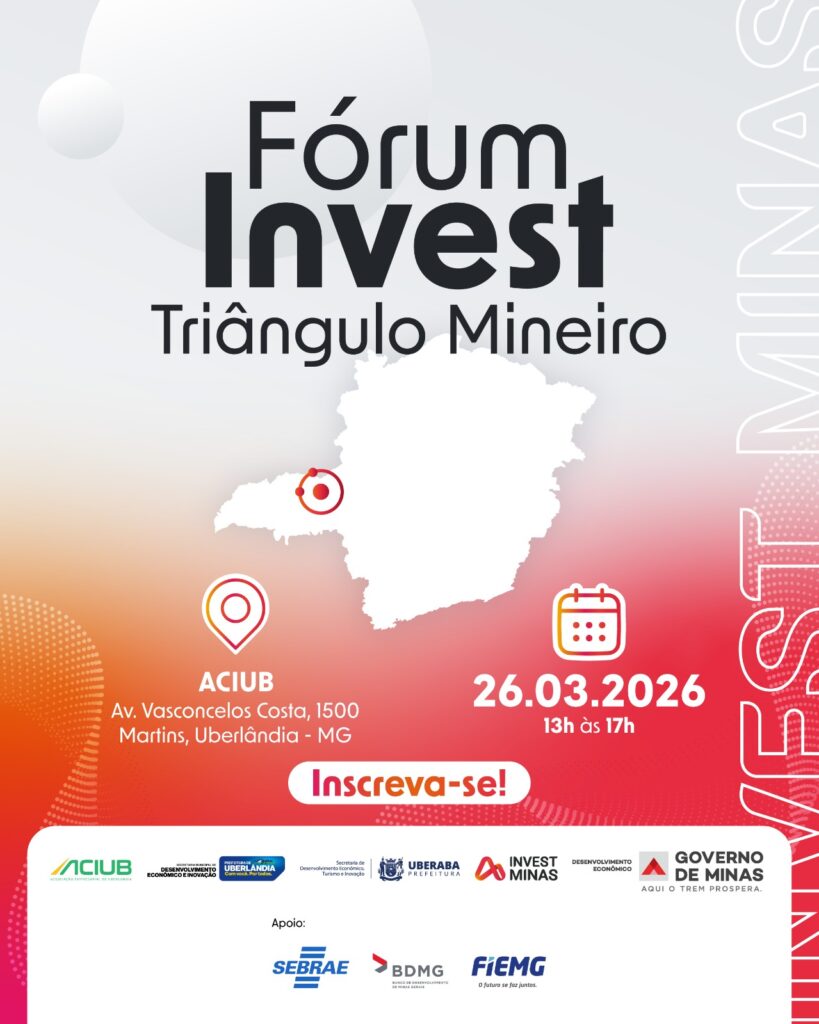 A Aciub, Associação Empresarial de Uberlândia, em parceria com a Invest Minas, realiza o Fórum Invest Triângulo Mineiro, que será realizado no dia 26 de março de 2026, das 13h às 17h, na sede da entidade, em Uberlândia. O evento reunirá lideranças públicas, empresariais e institucionais para discutir estratégias de atração de investimentos e fortalecimento do ambiente de negócios na região. Para participar é preciso se inscrever em aciub.com.br/inscricoes.