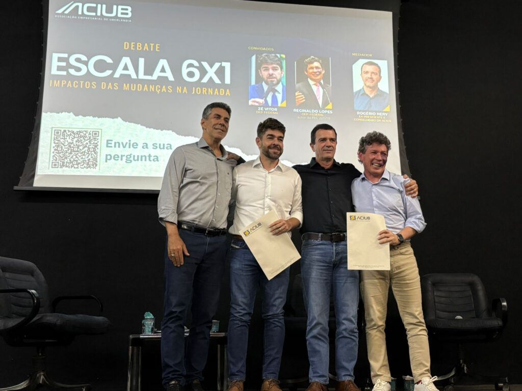 A Associação Empresarial de Uberlândia – Aciub realizou, nesta quinta-feira (23), o debate “Escala 6×1: impactos das mudanças na jornada”, reunindo representantes do poder público e empresários para discutir um tema de grande relevância para o ambiente de negócios no país. O encontro contou com a participação dos deputados federais Zé Vitor e Reginaldo Lopes, além da mediação do ex-presidente da entidade e membro do Conselho Superior, Rogério Nery.