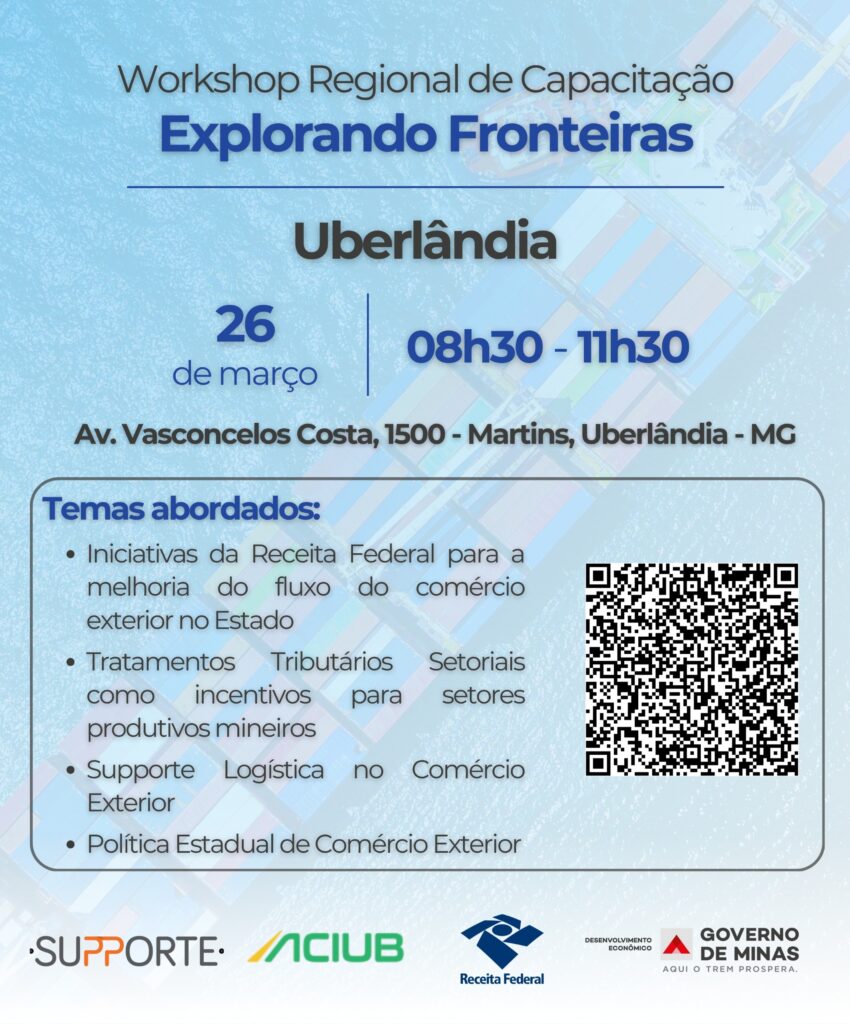 A Associação Empresarial de Uberlândia, Aciub, será palco, no próximo dia 26 de março, do Workshop Regional de Capacitação – Explorando Fronteiras, iniciativa que tem como objetivo fortalecer o conhecimento técnico e estratégico sobre comércio exterior entre empresas e profissionais da região. O encontro, que é uma iniciativa da Secretaria de Estado de Desenvolvimento Econômico de Minas Gerais e tem o apoio da Aciub, será realizado das 8h30 às 11h30, na sede da entidade, e para participar basta se inscrever em aciub.com.br/inscricoes.