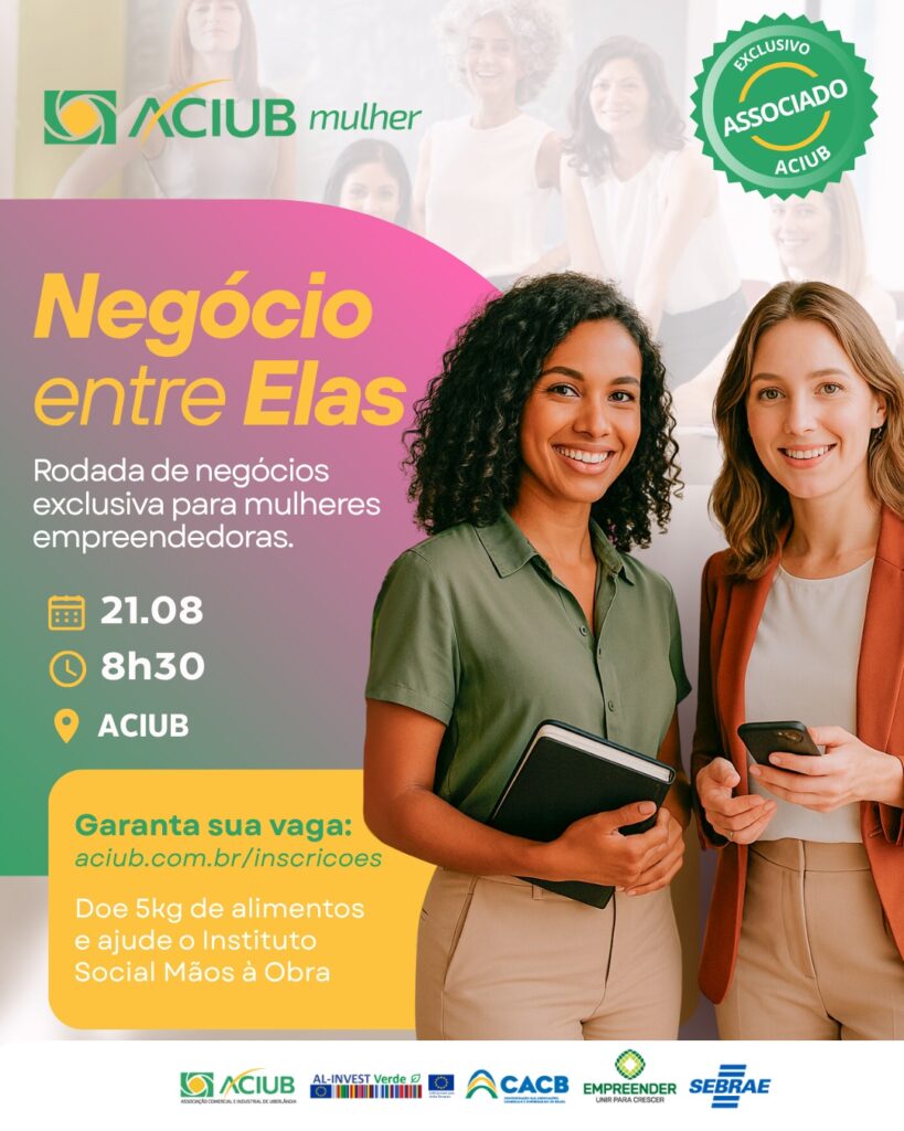 Para incentivar conexões mais acolhedoras, estratégicas e eficazes entre mulheres empreendedoras, a Aciub Mulher realiza o “Negócio entre Elas”, uma rodada de negócios exclusiva para mulheres associadas, no dia 21 de agosto, das 8h30 às 11h, na Aciub. O evento é gratuito, exclusivo para associadas, e para participar é necessário se inscrever no link aciub.com.br/inscricoes. […]