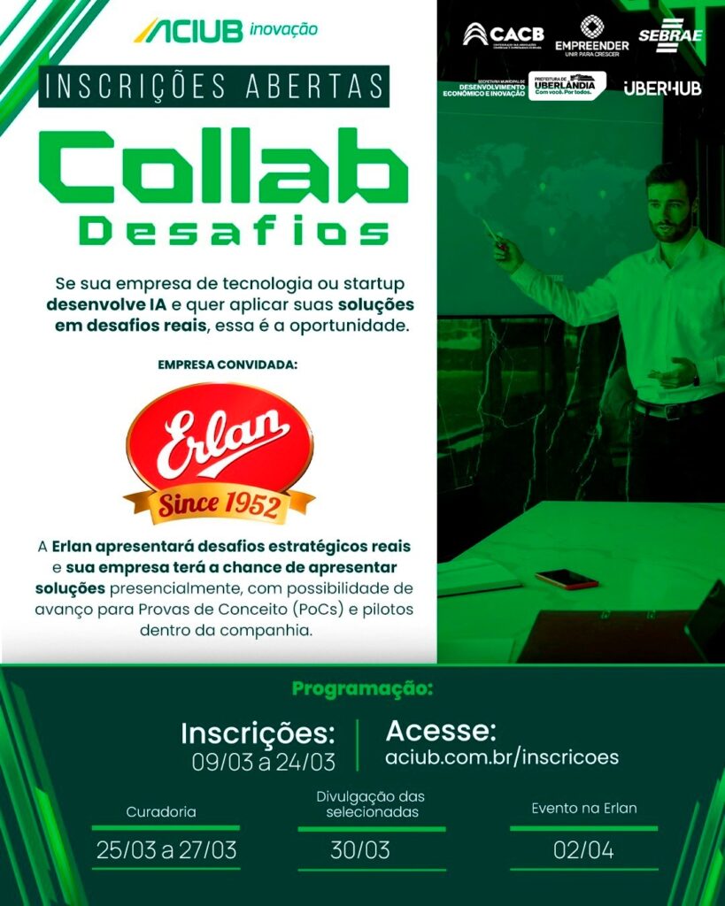 Erlan participa do programa com desafio estratégico em Inteligência Artificial voltado à geração de eficiência e valor para o negócio. A Associação Empresarial de Uberlândia – Aciub, por meio do Aciub Inovação, realiza o Collab Desafio, iniciativa voltada à promoção da inovação aberta corporativa no ambiente empresarial. Integrado ao movimento Collab Inovação, o projeto foi […]