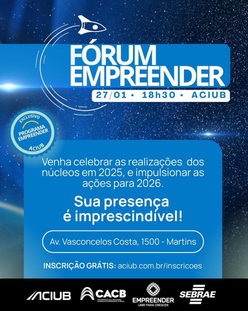 Encontro estratégico reunirá núcleos para análise de resultados e planejamento de novas metas no dia 27 de janeiro. A Aciub, reafirmando seu compromisso com o desenvolvimento econômico e o fortalecimento do associativismo, convida empresários e parceiros para o Fórum Empreender. O evento, que marca o início das atividades de 2026, será realizado na terça-feira, 27 […]