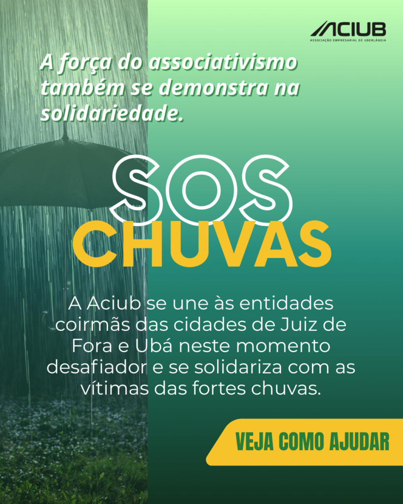 A Aciub, Associação Empresarial de Uberlândia, manifesta sua solidariedade às cidades de Ubá e Juiz de Fora diante das fortes chuvas que impactaram a população e o setor produtivo local. Neste momento desafiador, reforçamos nossa união ao sistema associativista mineiro e às entidades coirmãs ACEJF (Associação Comercial Empresarial de Juiz de Fora) e Aciuba (Associação […]