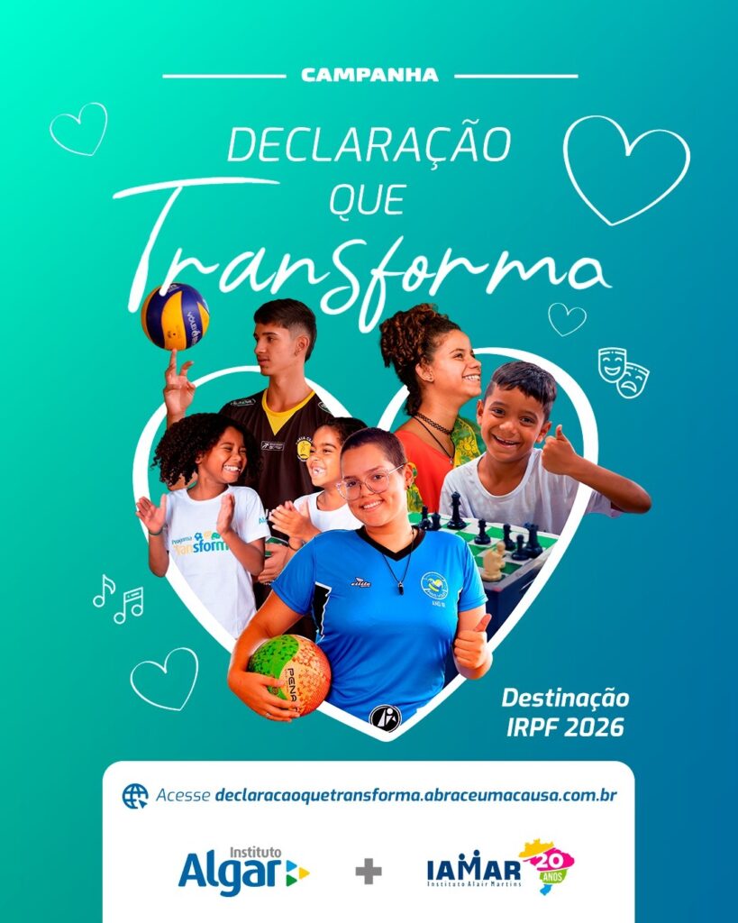 Pessoas físicas podem fazer doações de até 6% do IRPF devido para iniciativas apoiadas pelo Instituto Algar e receber a restituição do valor destinado ou o abatimento do valor a ser pago ao fazer a Declaração do Imposto de Renda 2026. A arrecadação será direcionada para a realização de oficinas de artes cênicas e atividades esportivas em organizações sociais de algumas cidades do país. As doações podem ser destinadas pelo site https://declaracaoquetransforma.abraceumacausa.com.br/