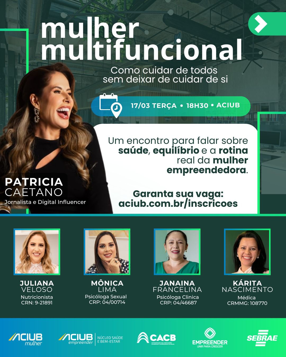 Evento reúne especialistas da saúde e palestra da jornalista Patrícia Caetano para discutir equilíbrio, bem-estar e a rotina da mulher empreendedora A Aciub, por meio