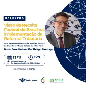 A Associação Comercial e Industrial de Uberlândia (Aciub), em parceria com a Delegacia da Receita Federal do Brasil em Uberlândia, realizam no dia 13 de