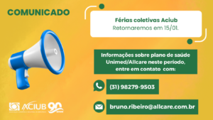 Informamos que a Associação Comercial e Industrial de Uberlândia (Aciub) estará em férias coletivas entre os dias 26 de dezembro e 14 de janeiro, retornando