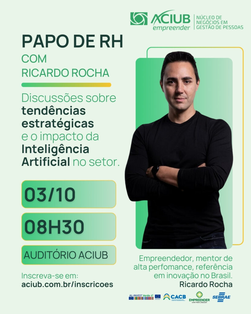 A Aciub, por meio do Núcleo de Negócios em Gestão de Pessoas do Programa Empreender, realiza no próximo dia 03/10, às 8h30, o evento “Papo de RH com Ricardo Rocha”, um encontro estratégico para profissionais que buscam aprimorar seus conhecimentos sobre as tendências e o futuro do setor.