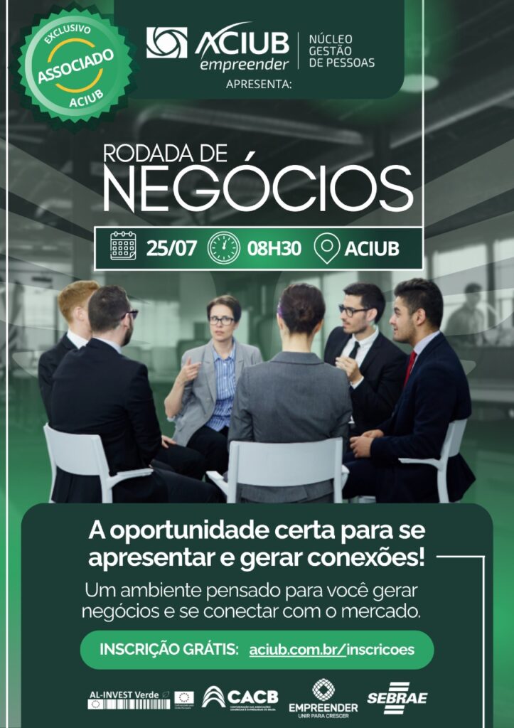 A Associação Comercial e Industrial de Uberlândia (ACIUB), por meio do Núcleo de Gestão de Pessoas, promoverá no dia 25 de julho uma Rodada de Negócios, evento que reúne empresários, empreendedores e profissionais associados da entidade de diferentes setores, com o objetivo de fomentar parcerias, ampliar redes de contatos e gerar novas oportunidades de negócios. Essa iniciativa é uma excelente oportunidade para quem busca expandir seus horizontes comerciais de forma eficiente e estratégica. As vagas são limitadas e as inscrições podem ser feitas em aciub.com.br/inscricoes.